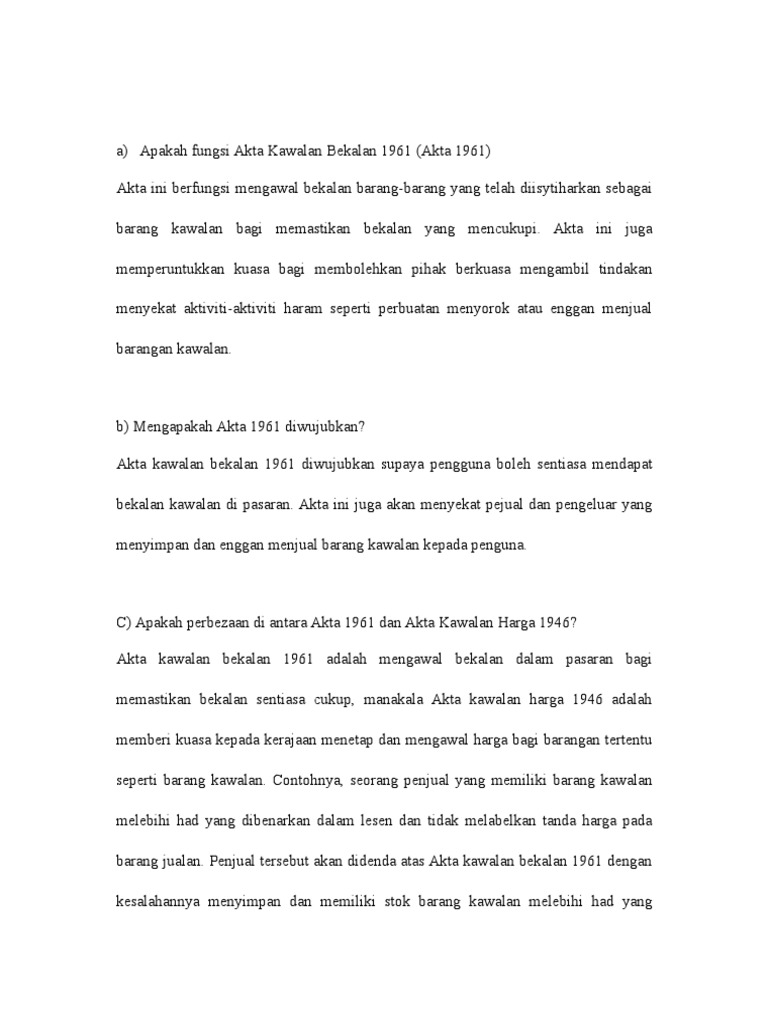 Akta kawalan harga 1946 pdf. Akta perhutanan negara 1984 (pindaan 1993) 5. Akta ini adalah suatu akta yang digunakan untuk mengadakan peruntukan bagi pengawalan harga dan juga dikenali akta 121. Melalui akta kawalan harga 1946 sedia ada, kerajaan hanya boleh mengawal harga terhadap barangan yang diwartakan saja, tetapi melalui akta baru itu, kerajaan berupaya mengawal peniaga daripada menaikkan harga sesuka hati. Nilai melindungi hak pengguna akta perlindungan pengguna 1999 akta kawalan harga 1946 akta kawalan bekalan 1961 akta timbang dan sukat 1972 akta perihal dagangan. Akta timbang dan sukat, 1972. Apakah kuasa dan hak kita sebagai pengguna untuk menghukum para peniaga dan. Akta pinjaman (bank pembangunan islam) 1977. Akta kawalan harga 1946 19. O akta kawalan harga 1946. Akta ini terpakai bagi semua jenis barangan termasuk barangan terpakai sama ada ianya dijual secara borong atau gudang ataupun jualan runcit. Akta penstabilan harga getah 1975. Akta kawalan harga, 1946 ( 1973 ).